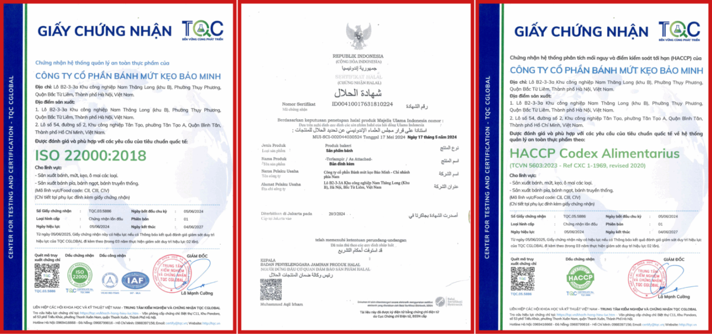 Bánh mứt kẹo Bảo Minh không chỉ được yêu mến nhờ hương vị truyền thống mà còn được khẳng định là thương hiệu uy tín nhờ đầu tư bài bản vào sản xuất và kiểm soát chất lượng. Các sản phẩm được chế biến tại nhà máy hiện đại, áp dụng quy trình khép kín và giám sát nghiêm ngặt nhằm đảm bảo an toàn thực phẩm.Uy tín của Bảo Minh được thể hiện qua nhiều chứng nhận quốc tế như ISO 22000:2018 về hệ thống quản lý an toàn thực phẩm; HACCP Codex Alimentarius – tiêu chuẩn phân tích mối nguy và kiểm soát rủi ro trong toàn bộ chuỗi sản xuất; cùng chứng nhận Halal, khẳng định tính minh bạch nguyên liệu và khả năng đáp ứng nhu cầu đa dạng của người tiêu dùng.
